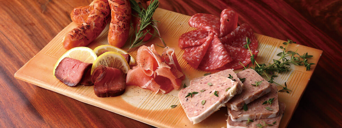 シャンパンをはじめ、特に赤ワインとお楽しみ頂きたい盛合せメニューです。例えば、骨付きフランク、鴨スモーク、高見牛のたたき、サラミ、タンドリーチキンなど。※内容が変わることもございます