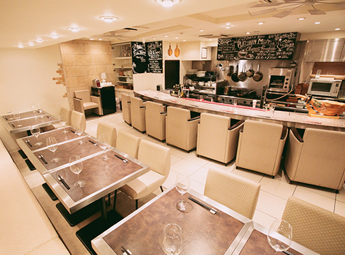 目の前でお料理ができあがっていく工程を楽しめるライブキッチンスタイルのカウンターは一人掛けのゆったりソファでゆったりお食事を楽しめます。